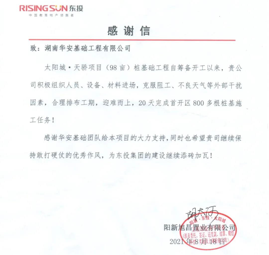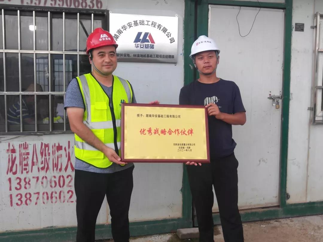 8月19日,华安基础湖北省黄石市阳新县98亩桩基项目工程部办公室收到阳新县旭昌置业有限公司赠予的“优秀战略合作伙伴”牌匾和感谢信。
