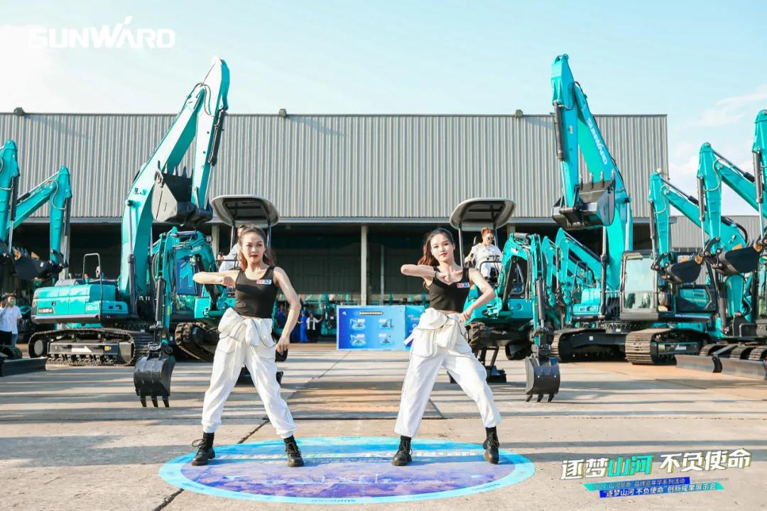 △挖机宝贝们进行设备展示和舞蹈秀。同台的设备与表演者,灵动可人。