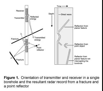 对于单孔反射方式,雷达提供钻孔周围基岩的不连续的图像,包括基岩面、不同的岩性界面、裂隙及溶洞。根据天线和设备的类型,可以用方向性天线或非方向性天线进行测量。对于层析方式,发射和接收在不同的孔中,雷达提供钻孔间的平面图像。调查的半径取决于天线的频率和介质的电导率。对于一个中心频率为100兆的天线,做反射时的探测距离在大阻抗的岩石中是10-40米,在导体、富粘土或泥岩中要小于5米。