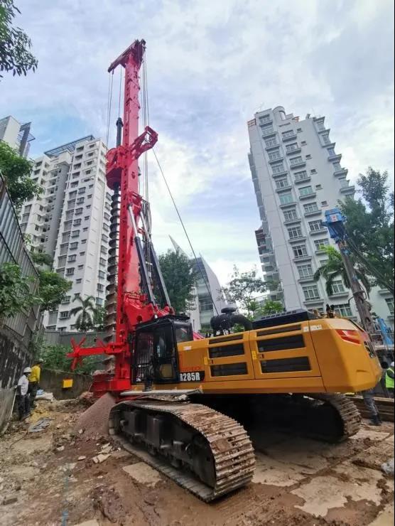 SR285M所处工地为新加坡莫尔敏大厦308140号地段,该项目属于住房开发项目,钻孔处工程地质状况一般为回填土层(6m厚),下方为完全风化的句容组粉砂岩、砂岩和高度风化砂岩土层,土体强度普遍随深度增大。由于土层较硬,一般长螺旋钻机钻进困难,得益于SR285M强大的扭矩和加压力,现场表现突出、高效施工,得到客户好评。