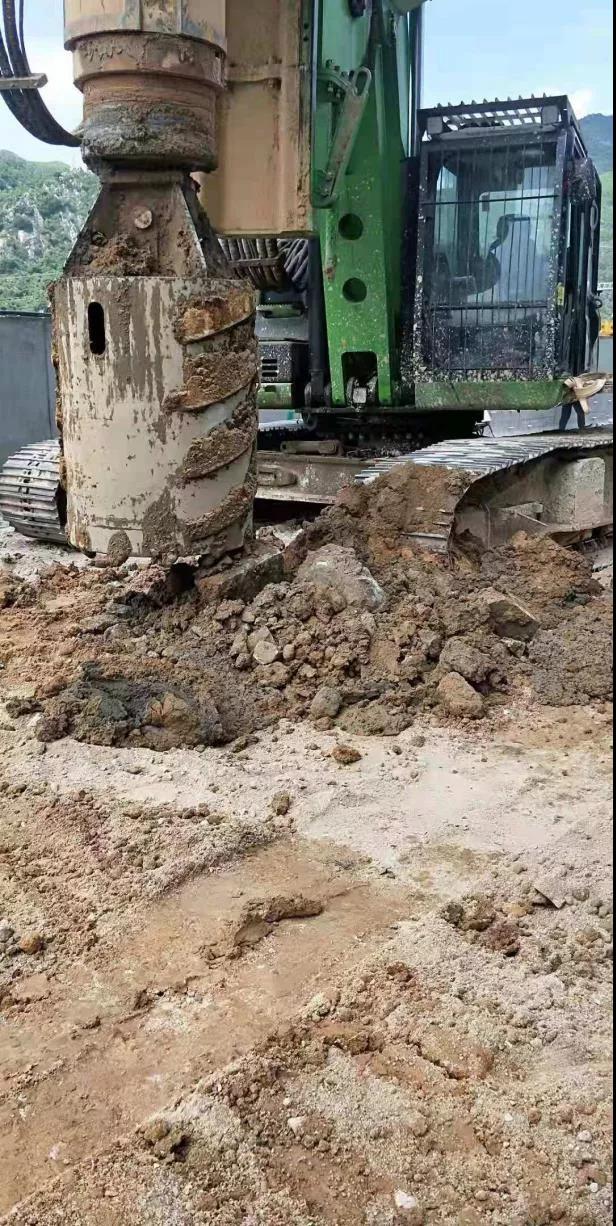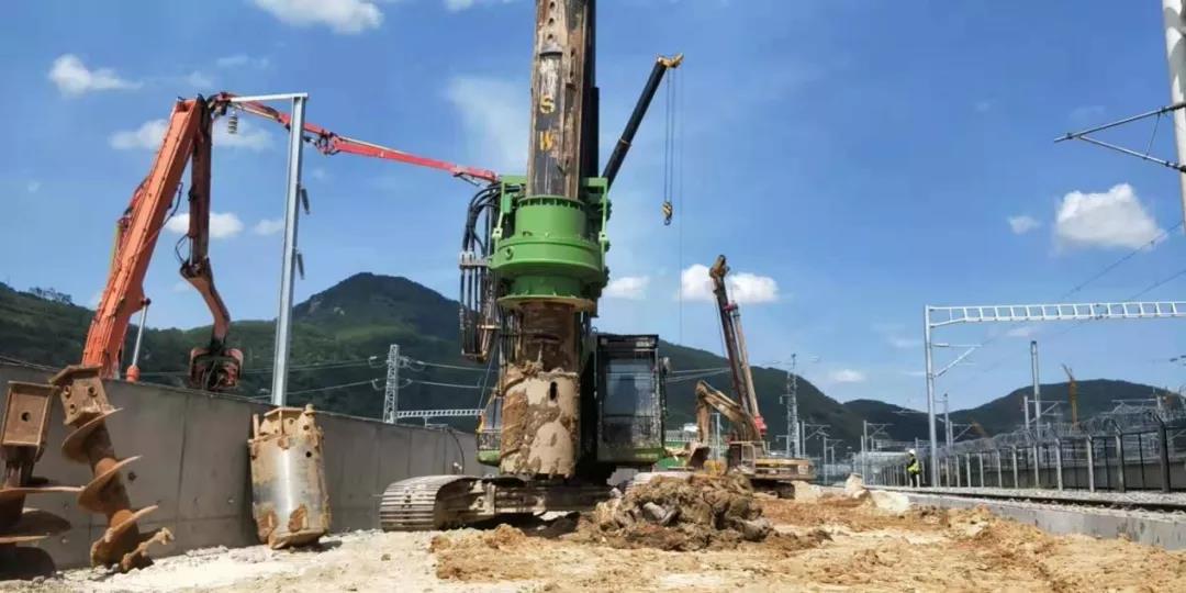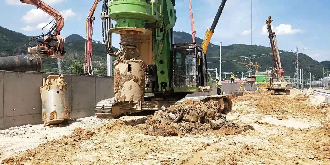 该项目属于泉州高铁站扩建工程,毗邻正在运营的高铁站,每日往来高铁班次较多,要求施工过程中不能对高铁运营产生任何影响。同时施工设备要求高度不能超过11米,桩径1米。现场施工地层为回填塘渣,回填地层地质情况比较复杂,有较大回填石块,粒径20~200mm不等,个别存在较大石块,并且回填深度在0~8米不等,属于易塌孔地层。施工过程中不能对周边地层形成扰动,以免影响高铁正常运营,所需设备要满足较强动力及入岩能力,施工难度极大。泰信KR300ES旋挖钻机最大钻孔深度35米,施工高度10米,最大施工直径2米,动力头扭矩320kN.m。解决了工程施工中遇到的空间小、桩径大、深度深、扭矩大且能入岩等难题,能够在兼顾较低的施工高度和超深的施工深度条件下,完成大口径入岩施工。