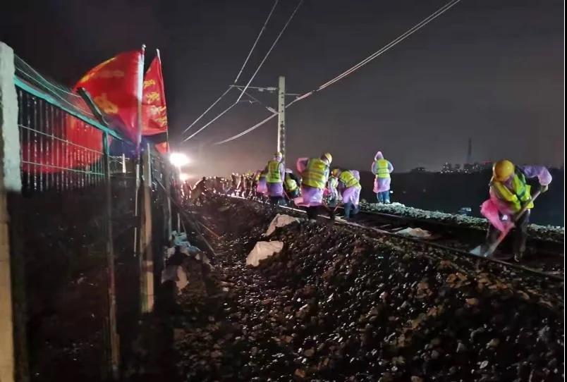 抢险队员冒雨连夜抢修受损铁路