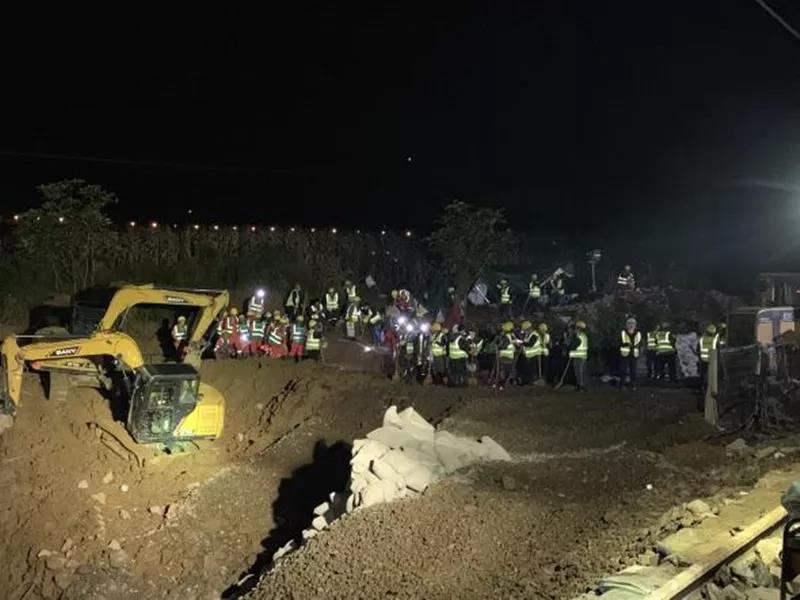 28日晚23时30分,107名抢险队员赶到抢险地点并立即展开抢险工作。由于地形因素,大型机械无法进场,为了用最快的速度完成抢险任务,救援组因地制宜,启动人海战术,采用蚂蚁搬家方式,人工挑抬运道砟160立方。