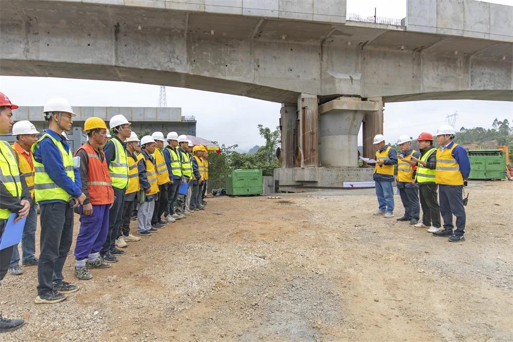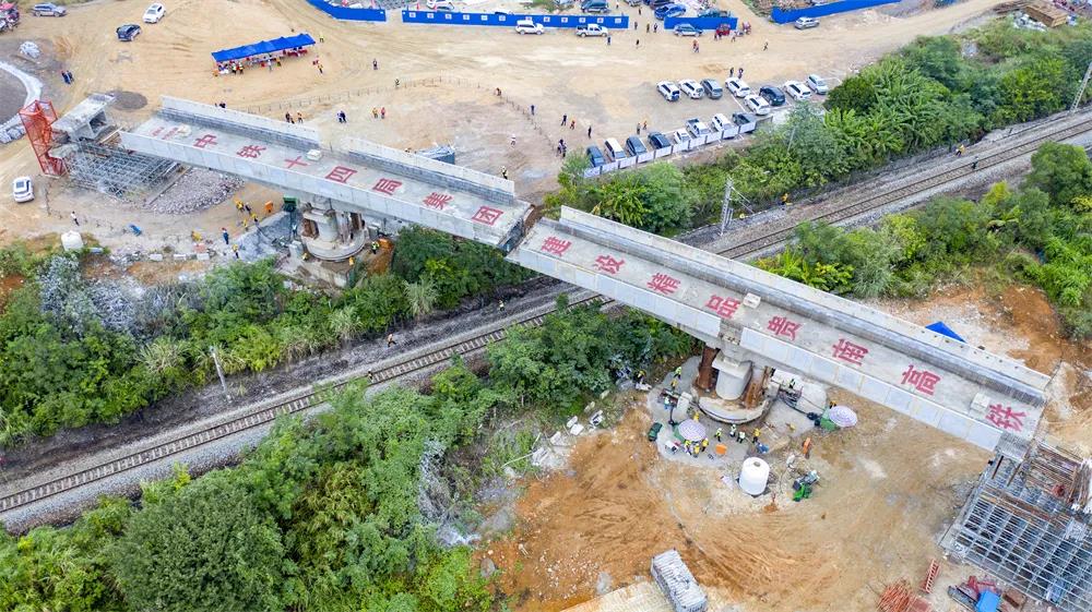 此次施工的河池动货基地联络线1号大桥是贵南高铁全线桥梁的控制性工程,全长270米,上跨既有黔桂铁路。由于黔桂铁路平均每20分钟就有一趟列车经过,行车密度很大,每天留给施工人员的“天窗期”不足2.5个小时,采用传统桥梁施工方式不仅会对日常行车产生影响,还会滞后工程总体进度。