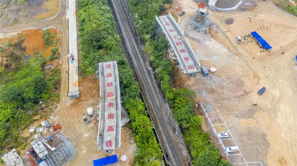 中铁十四局承建了贵南高铁2座曲线半径为300米的小半径转体桥,分别为河池动货基地联络线1号、2号大桥。其中河池动货基地联络线2号桥于8月5日顺利完成转体。