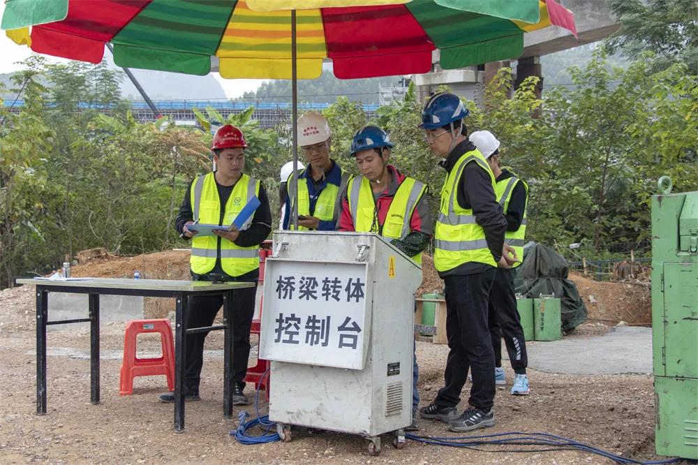10月19日19时,经过施工人员115分钟紧张有序的操作,贵南高铁河池动货基地联络线1号大桥两榀转体连续梁在13米高的空中完美“转身”,并在指定桥位上顺利“握手”,标志着贵南高铁又一座国内曲线半径最小铁路转体桥顺利完成转体,至此该铁路全线转体梁工程顺利结束。
