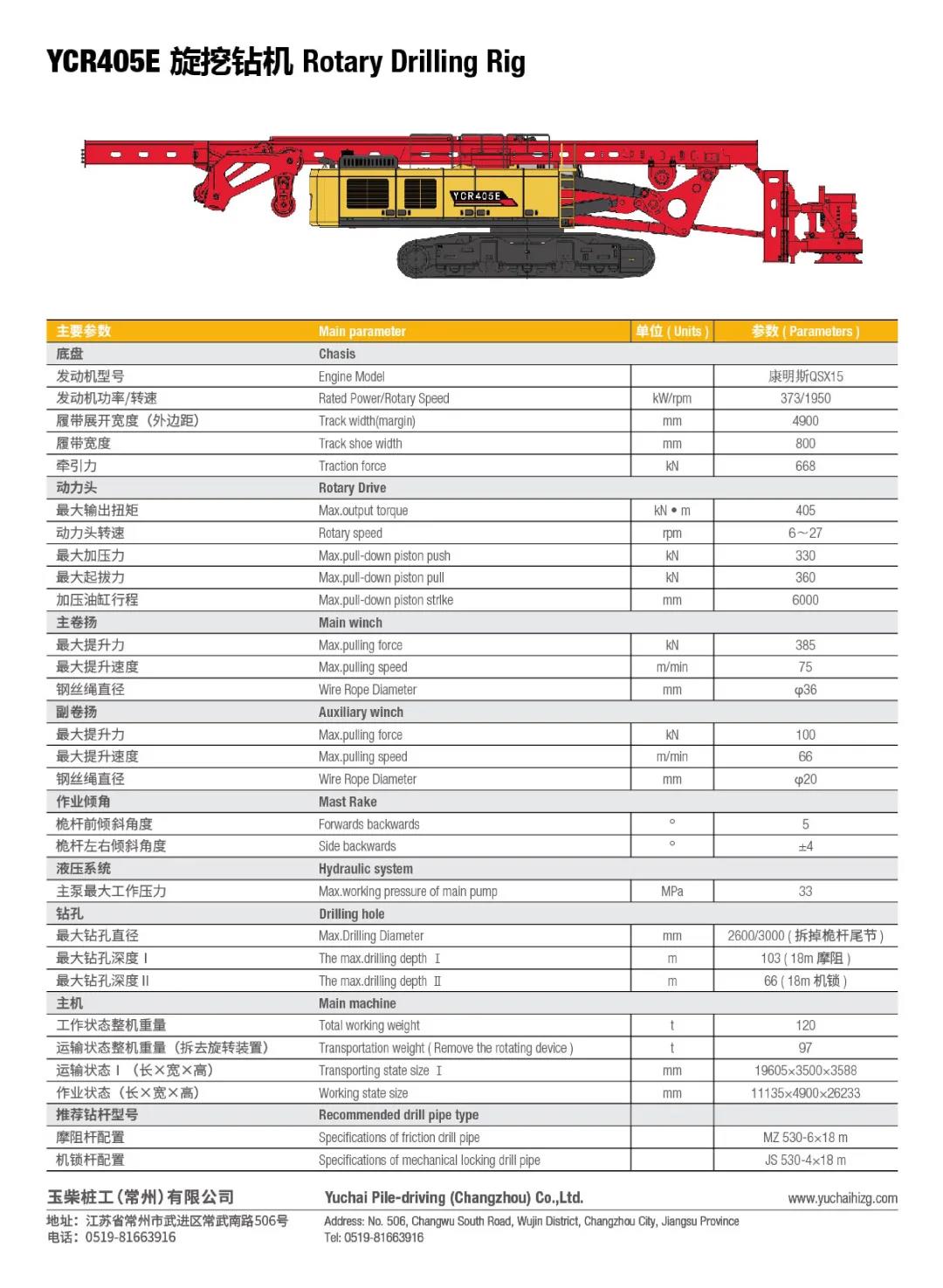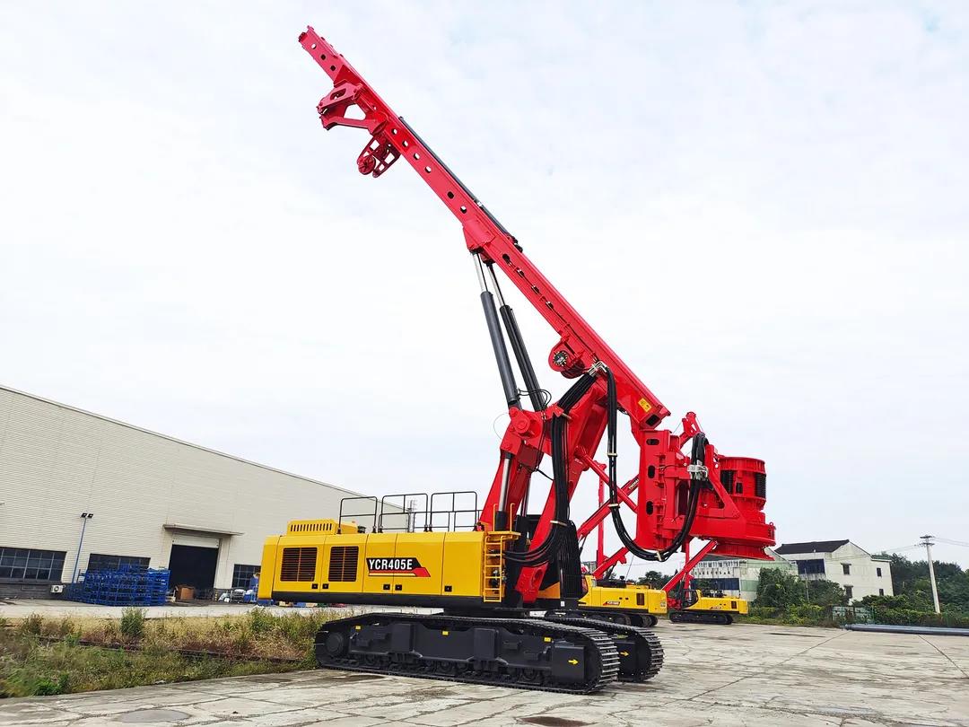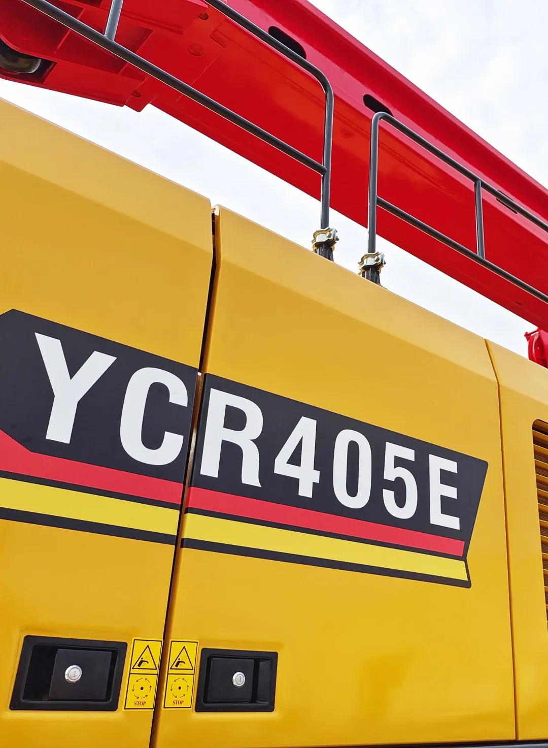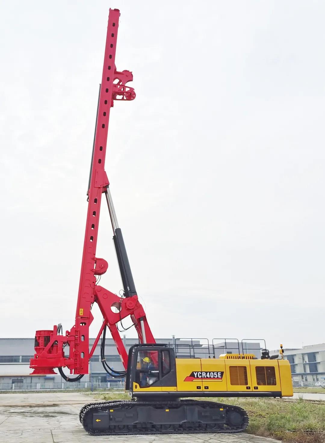 玉柴YCR405E大型旋挖钻机是玉柴桩工根据市场行情,专门针对入岩工况开发的大型旋挖钻机,其钻孔直径可达3米,最大钻孔深度达103米,最大输出扭矩为405 kN.m,工作状态下整机重量达120吨,可以实现在深孔、大直径、硬地层等恶劣工况环境下施工,整车采用有限元受力分析,保证整车质量稳定性和可靠性,动力采用原装康明斯发动机,满足非道路国三排放要求。匹配旋挖钻机专用伸缩式底盘,与同级别竞品相比尺寸最大,更有利于各项主参数实际输出,达到上车轻量化、提升效率、降低油耗的目的。