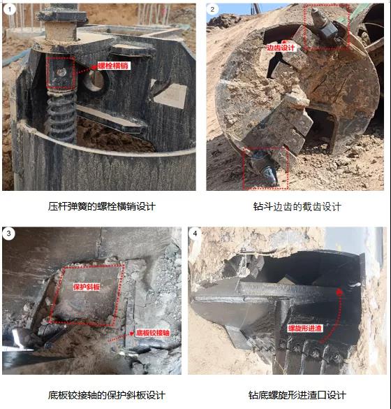 4.螺旋钻底,快速进渣:三一轻载土斗钻底采用螺旋形设计,且钻底较高,使得钻底进渣的空间增大,开口面积较友商钻斗提高约24%。