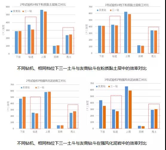 甘肃天水万达南站A地块房建项目,桩径0.8m,桩深51m,施工地层为粉质黏土、强-中风化泥岩。三一轻载土斗在粉质黏土、强-中风化泥岩中整体施工效率较友商钻斗分别快3.5%和5%。尤其是纯钻进效率,三一轻载土斗平均每米耗时仅15.9s;相较而言,无论在粉质黏土层中,还是在强风化泥岩中,三一轻载土斗钻进效率均较友商钻快10%以上。现场三位机手师傅对三一轻载土斗的钻进效率一致给予了中肯的评价。