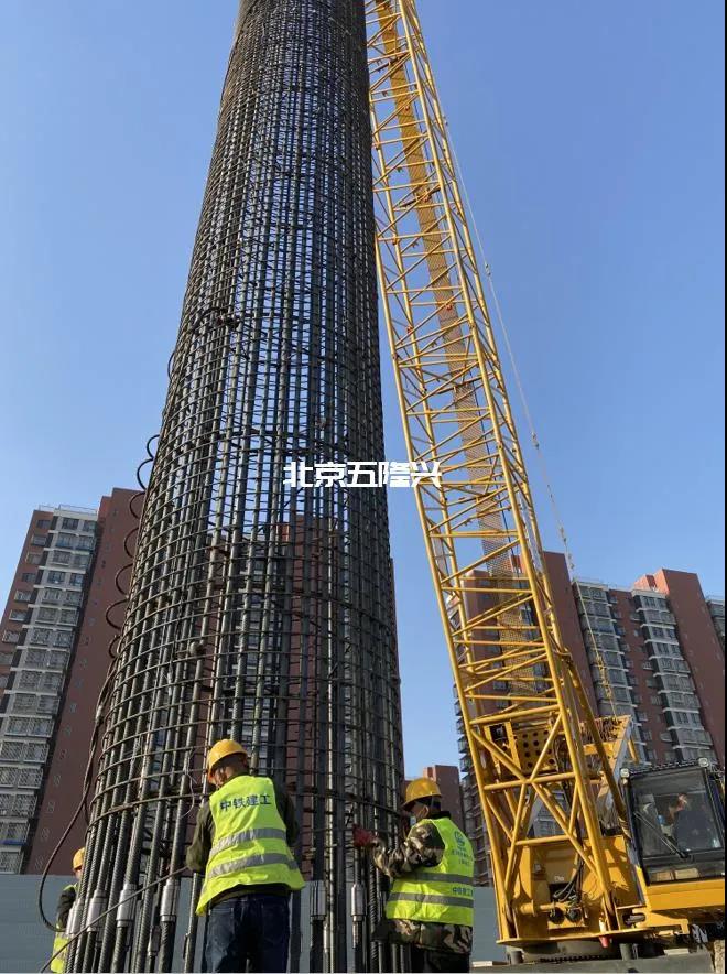 3.钢筋笼吊起连接(桩基钢筋笼直径达2.2米,桩基深度78.5米,总重量达到80吨,全部采用50规格钢筋)