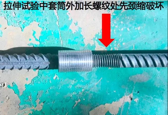 双螺套连接技术相比于传统的连接方式操作更简单便捷,能够完美避免上下轨迹线不重合导致连接困难。传统的滚压直螺纹加长丝连接尽管施加外力连接,也会导致内螺纹损伤,强度低,连接后露丝严重,在拉伸试验中套筒加长螺纹处先颈缩破坏。