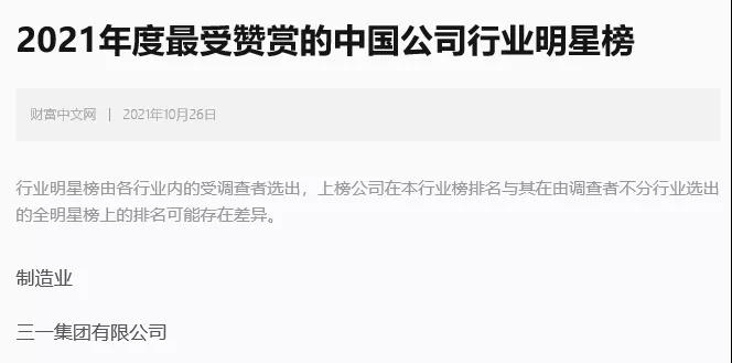 10月26日,《财富》(中文版)发布“2021年最受赞赏的中国公司”全明星榜,三一集团第十一次上榜,高居榜单第四位。同时,在行业明星榜中,三一集团位列制造业榜首,连续三年摘得“制造业最受赞赏的中国公司”桂冠。