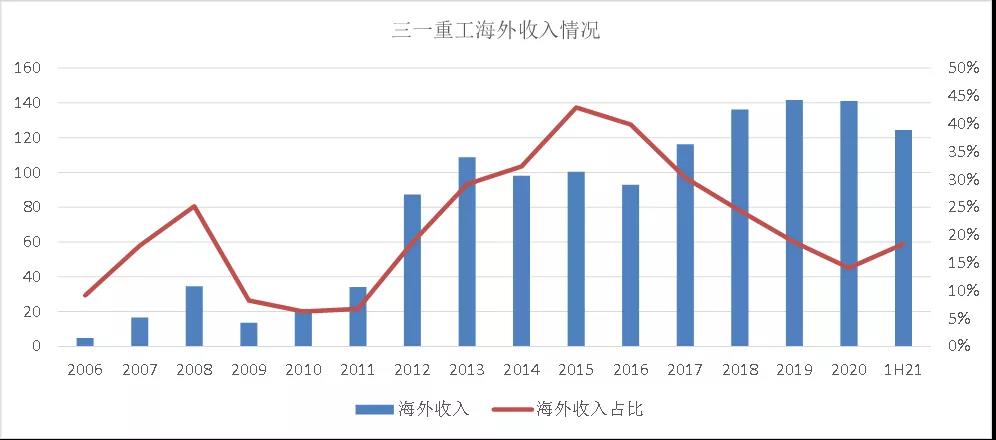 更值得注意的是,在制造业公司中,三一是最早一批走向全球化的中国企业。以其上市平台之一三一重工的数据为例,海外收入早已破百亿,收入占比最高的时候接近4成。可以说,三一也是最契合一带一路倡议的企业之一。