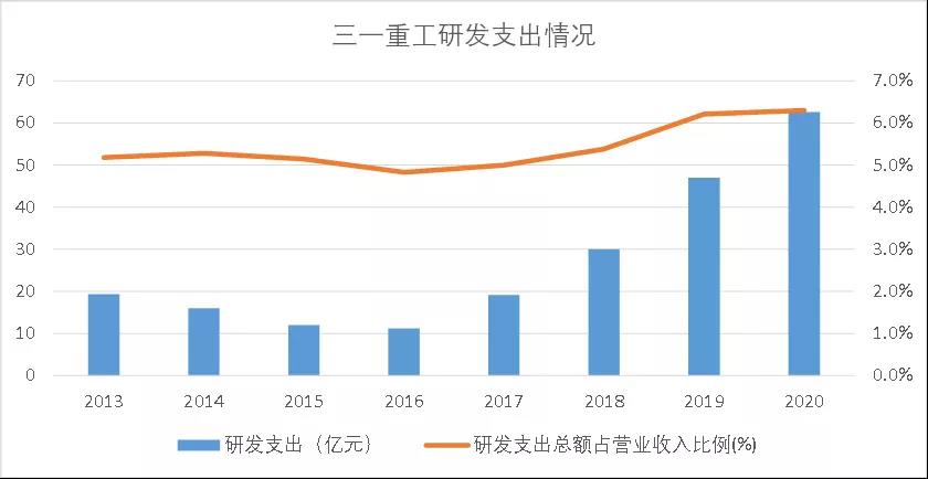 与之配套的是真金白银的投入,仍然以三一集团旗下的三一重工为例,从2018年开始,公司的研发支出占比从5%逐渐上升到6.3%,绝对金额也快速提升到30亿元,然后提升到60亿元。要知道,2018年工程机械才刚刚复苏进入新一轮周期,彼时三一重工的净利润也仅60亿元。