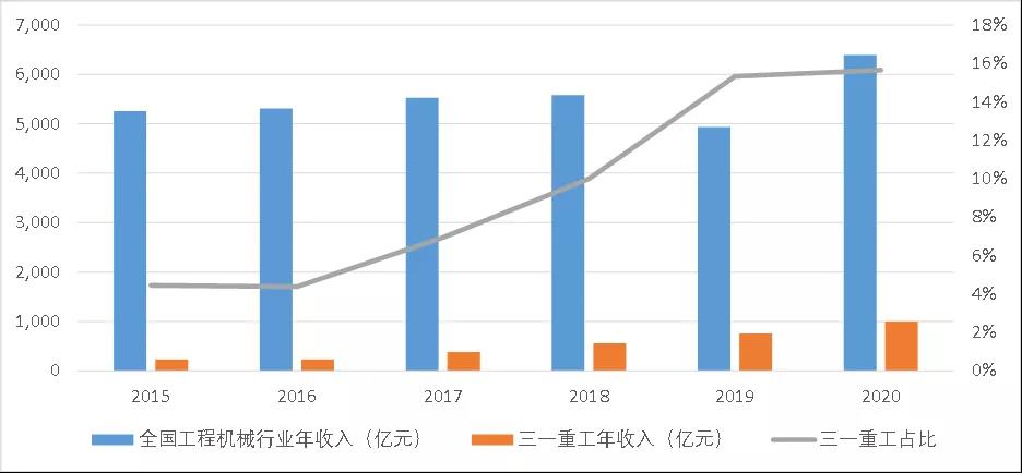 ●工程机械行业是一个规模巨大的行业,在中国,工程机械行业企业数量高达约1500家,平均年销售额仅4-5亿元。从体量上来说,三一是绝对的龙头企业,2020年,三一集团旗下的三一重工,收入达到1000亿元,占整个工程机械行业的比重高达16%(如果是三一集团整体,这个比重还将进一步上升到21%)。
