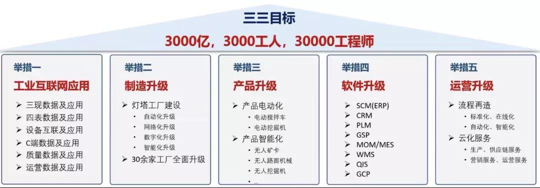 ●在梁董事长的带领下,三一设定了数字化转型战略的具体目标,内部称为三三目标:3000亿销售额,3000工人,30000工程师。