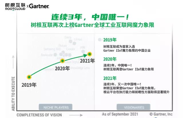 正是因为造梦师给产业带来的脱胎换骨的改变,树根互联连续三年成为中国唯一上榜Gartner全球工业互联网魔力象限的企业。入选理由为:1)生态开放,树根互联为整个工业价值链贡献价值;2)技术创新,前瞻性与执行能力突出;3)成功落地,世界级灯塔工程照亮工业转型之路。
