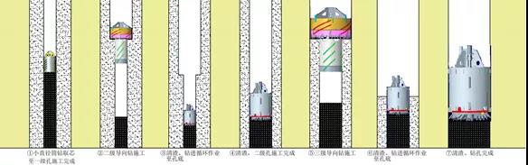 当硬岩地层中存在软弱破碎带或明显结构面时,加压钻进很容易导致钻孔偏斜,施工时一般采用分级钻进工法,即便使用分级钻进,在大直径筒钻扩孔时也难以有效保证钻孔垂直度。为解决大孔、深桩、斜岩钻进过程中出现的偏孔问题,客户往往会选择使用导向钻施工,导向钻可以有效利用上一级钻孔对本级钻进进行导向。