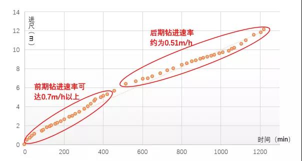 我司导向钻综合钻进速率约为0.60m/h;前期钻进效率可达0.70m/h以上,后期钻进效率约为0.51m/h左右;原导向钻整体钻进速率约为0.42m/h,钻进效率较慢且机身抖动过大,无法继续使用该斗。从现有数据来看看,我司导向钻钻进效率比原导向钻提高20%以上。
