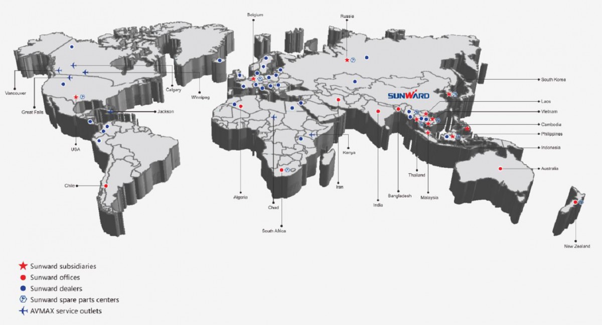 据了解,山河智能早在2002年就开始了国际市场布局,如今,代理商遍布全球。截止目前,印有SUNWARD商标的产品已经销往全球100多个地区和国家,公司不断加大投入,在海外已成立了十多家子公司,与180多家代理商一起建立了遍布全球的营销服务网络和配件仓库,让客户没有后顾之忧。