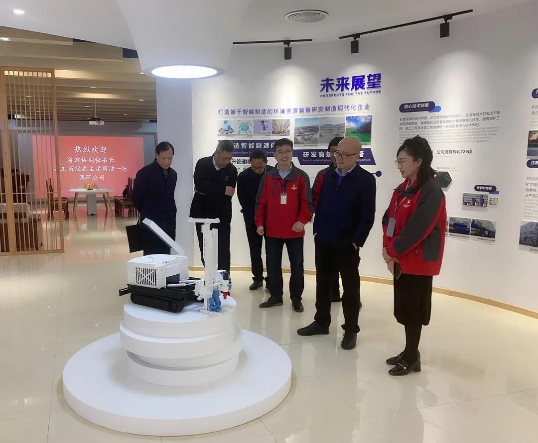 交流期间,周主席一行听取了江苏锡探从地质勘探钻机到全液压工程施工钻机,再到全智能环境取样钻机的三次重要历史跨越,询问了当前各门类钻机的行业地位和市场份额,勉励企业将“专精特新”产品——土壤取样修复一体钻机做大做强,紧跟国家产业导向和“碳达峰、碳中和”这一大趋势,做土壤环境行业和先行者,更要做行业的标杆和领头示范。