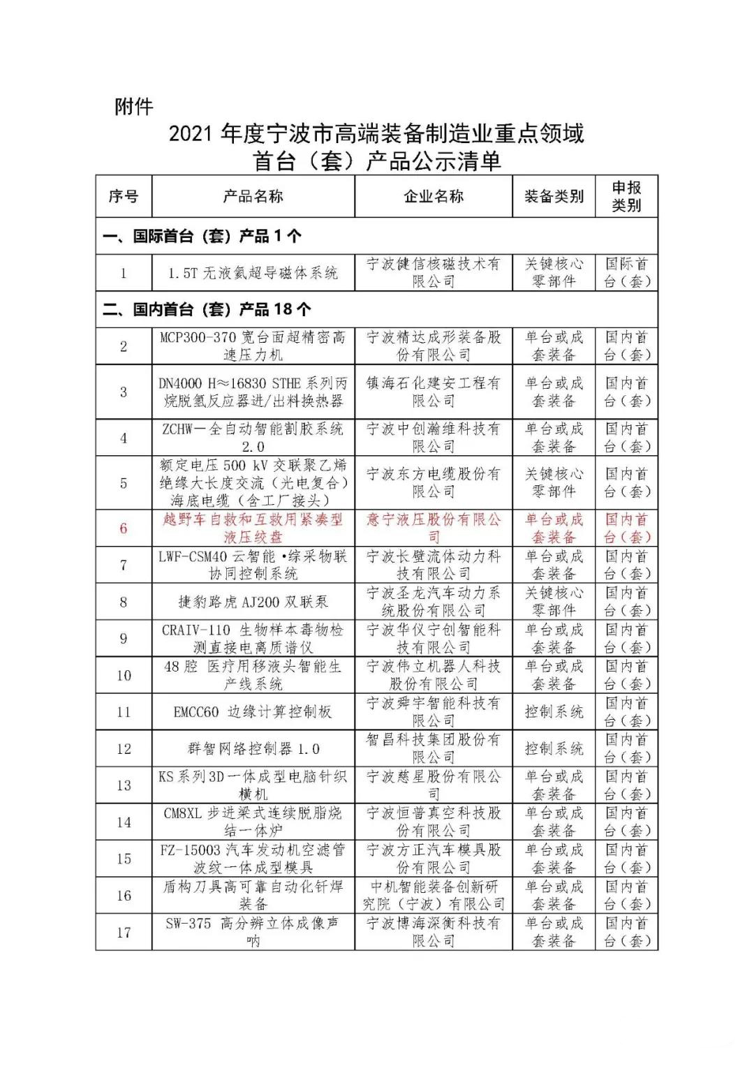 11月17日,经浙江省经济和信息化厅复核公布“2021年度宁波市高端装备制造业重点领域首台(套)产品名单”(见附件),1项国际首台(套)产品,18项产品获国内首台(套),51项产品获省内首台(套)。其中第6项意宁液压股份有限公司自主研发并量产的“越野车自救和互救用紧凑型液压绞盘”获评高端装备制造业重点领域国内首台(套)产品。这是意宁液压史上首次获此殊荣,创造了意宁液压新辉煌。