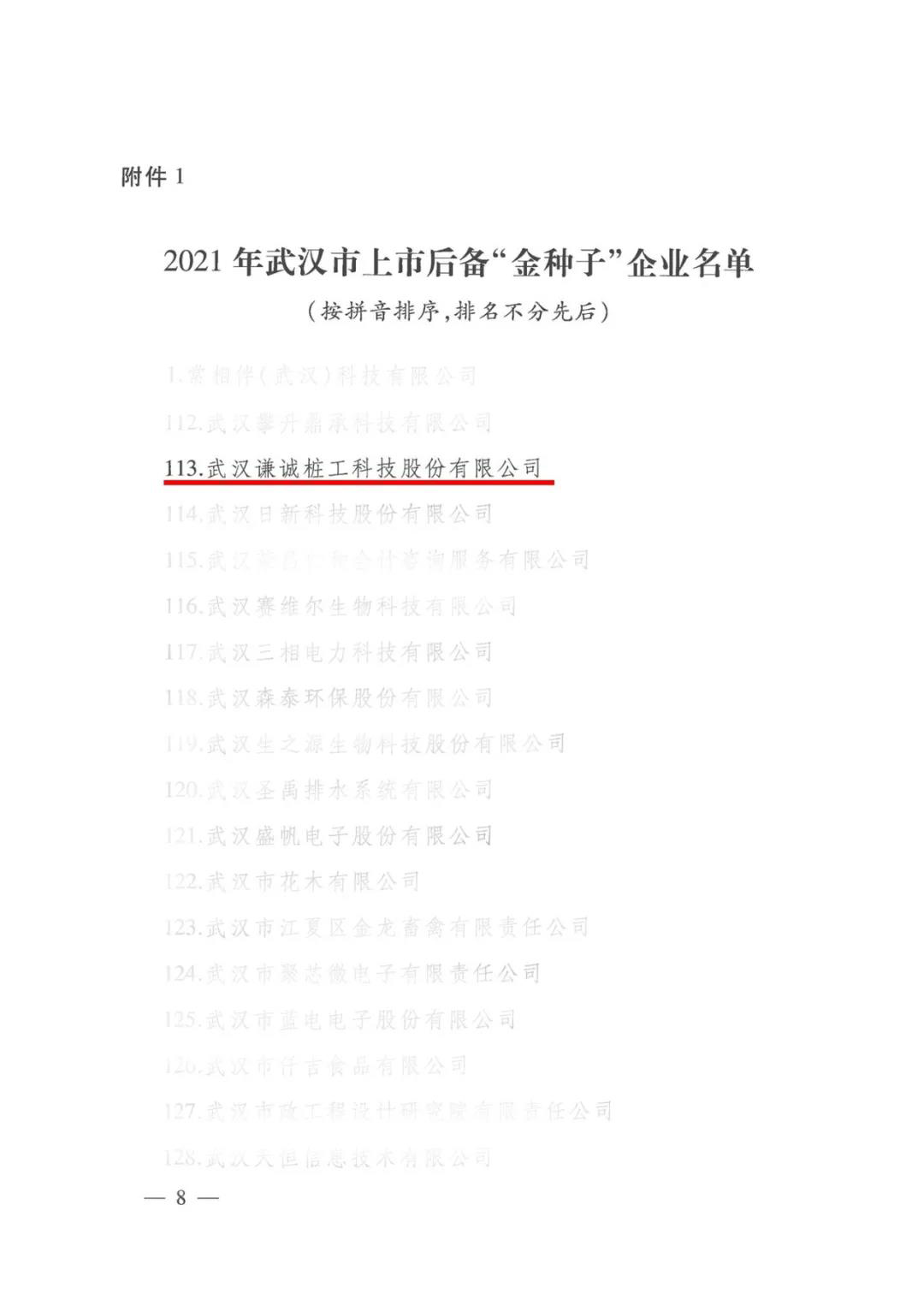 近日,2021年武汉市上市后备“金种子”、“银种子”企业名单公布,谦诚桩工再次榜上有名,入选武汉市上市后备“金种子”企业名单!