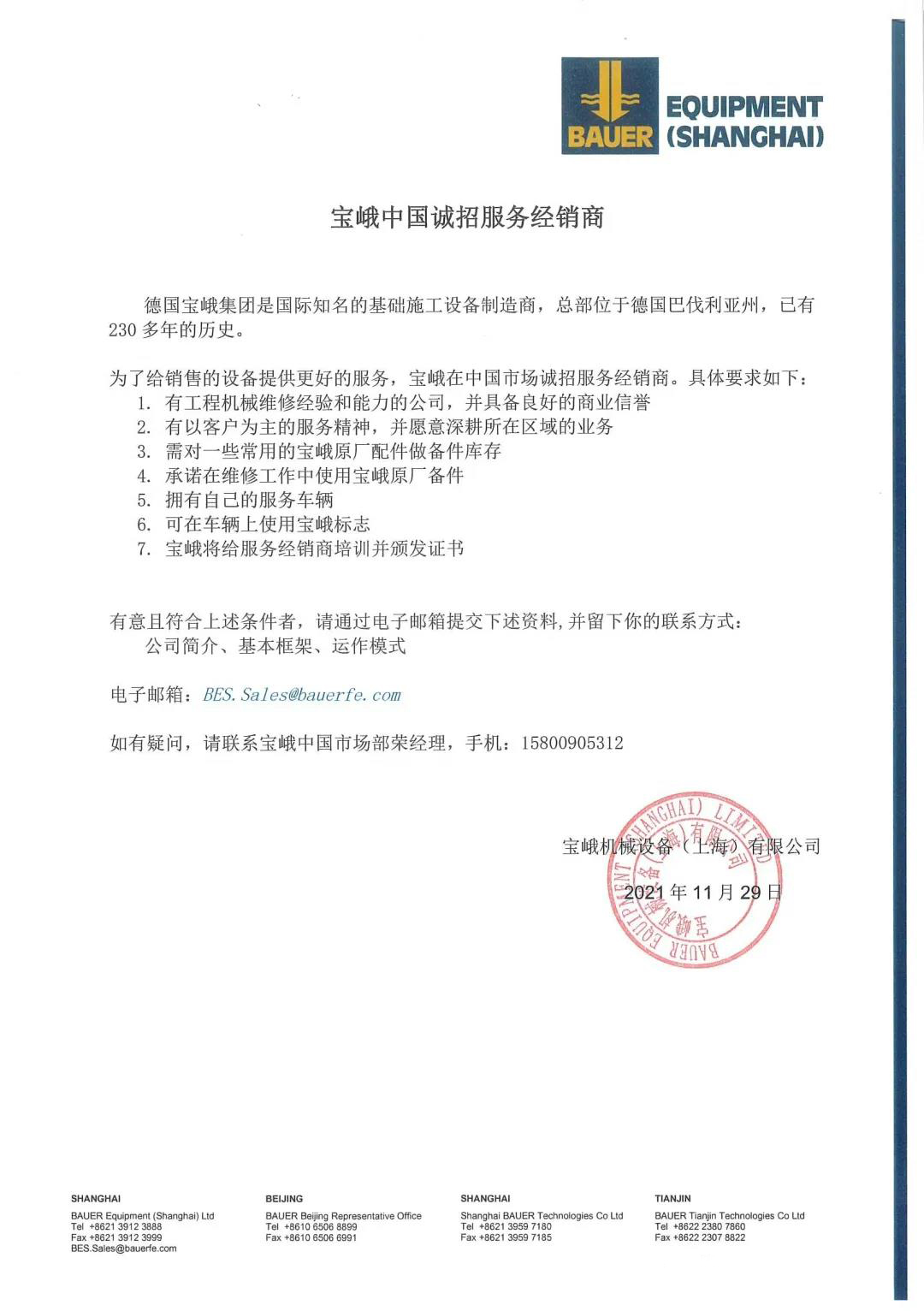 为了给销售的设备提供更好的服务,宝峨在中国市场诚招服务经销商。具体要求请见以下通知: