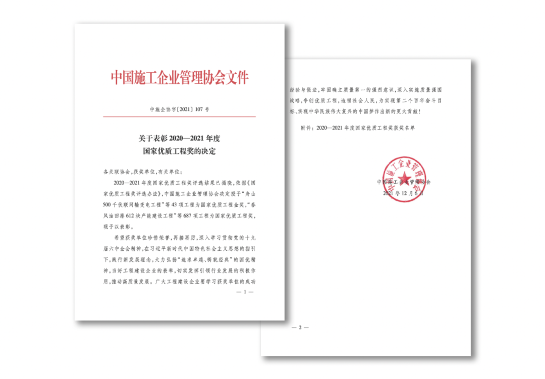 12月7日,中国施工企业管理协会公布《关于表彰2020—2021年度国家优质工程奖的决定》,决定授予43项工程为国家优质工程金奖,687项工程为国家优质工程奖。
