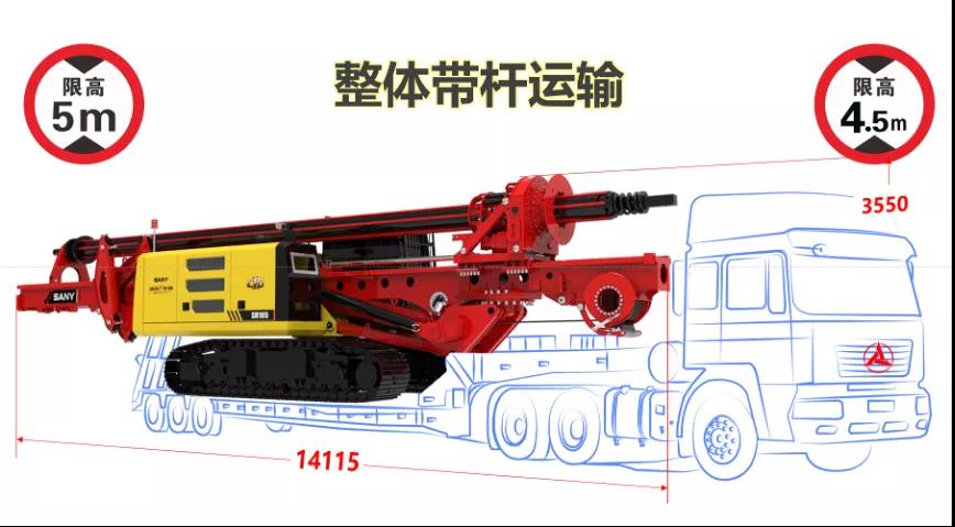 SR165可以携带钻杆转场运输,减少一辆板车的费用。整个高度仅3.55m,可以通行国内各类道路,无论何地均可使命必达。
