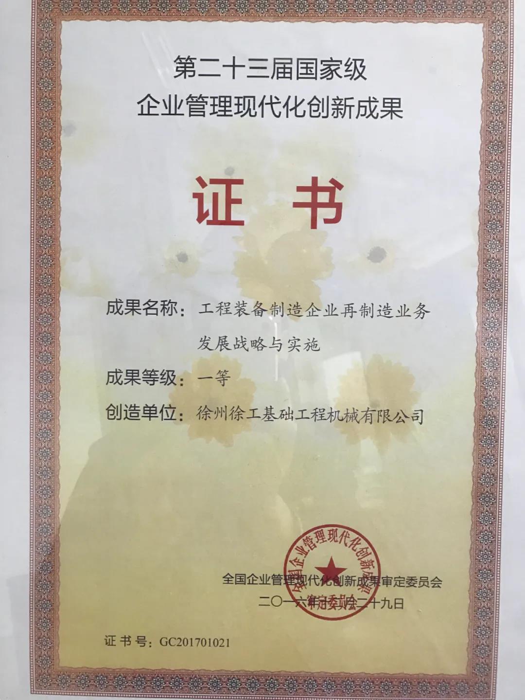 徐工基础再制造业务成果获得第二十三届国家级企业管理现代化创新成果一等奖。