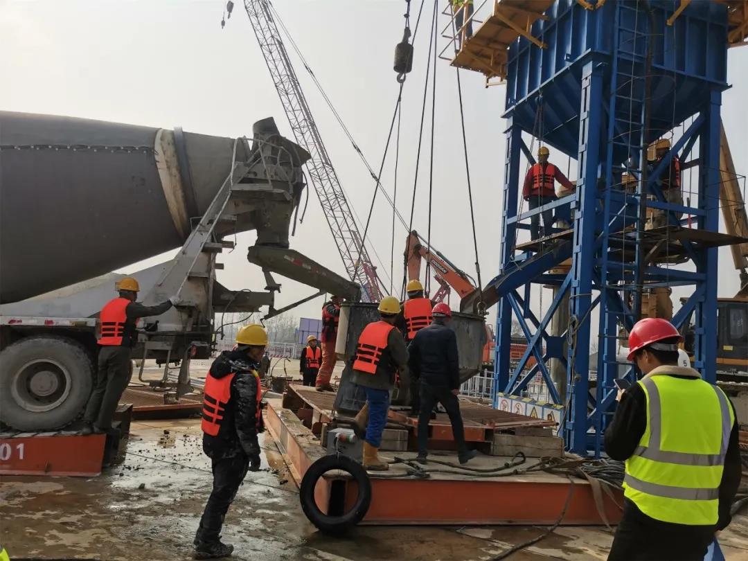采用大料斗拔球首封,罐车倒入式灌注