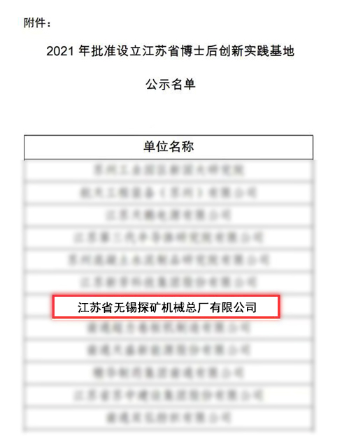 基础工程网、《基础工程》杂志社讯 近日,江苏省人社厅公布了“2021年批准设立江苏省博士后创新实践基地名单”,祝贺江苏省无锡探矿机械总厂有限公司(简称“江苏锡探”)榜上有名!