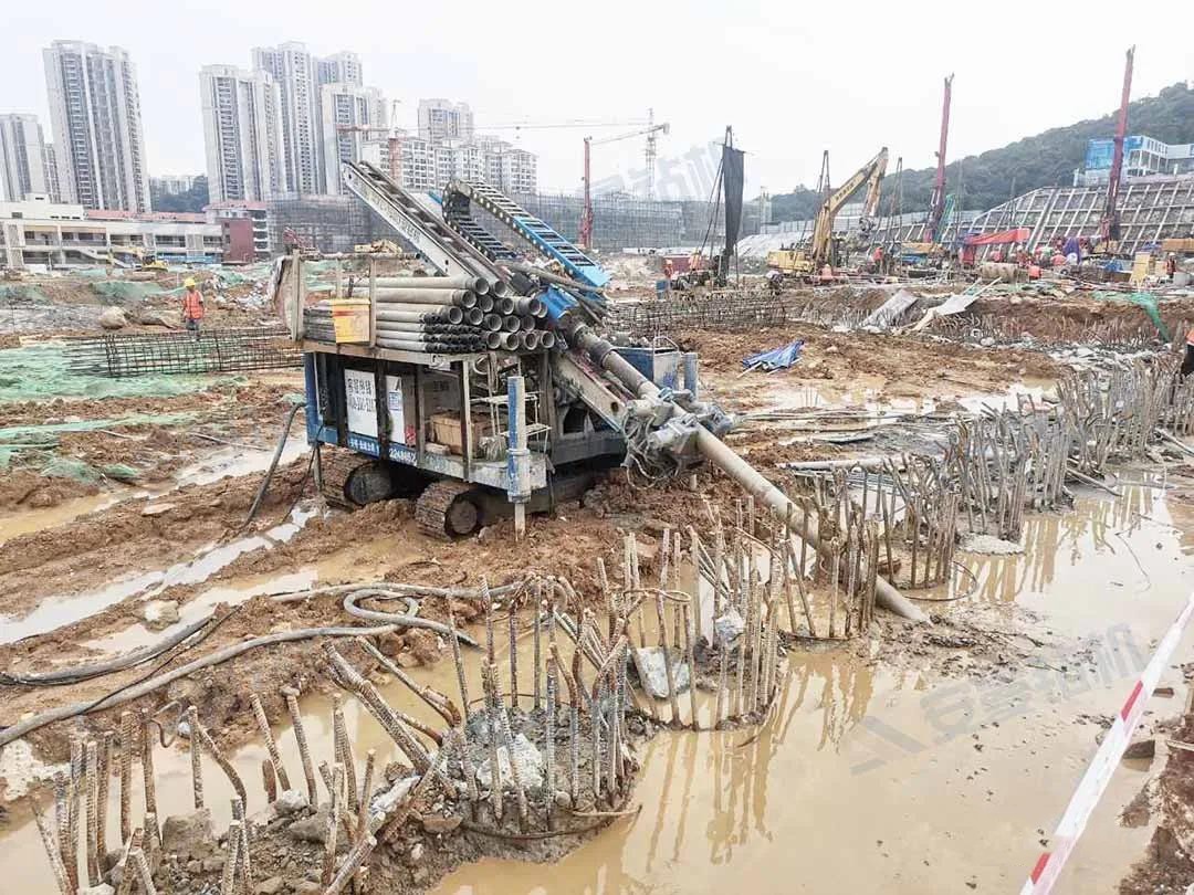 2、安装套管和套管钻头,启动水泵,钻孔至中风化岩面;