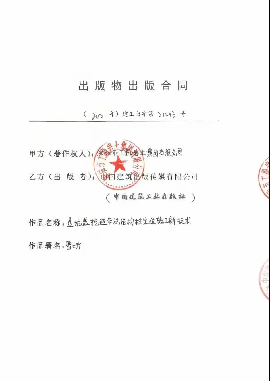五广(上海)基础工程有限公司联合深圳市工勘岩土集团有限公司雷斌创新工作室共同合作编写出的基坑盖挖逆作法结构柱定位施工新技术,约定2022年10月在中国建筑出版传媒有限公司(中国建筑工艺出版社)《实用岩土工程施工新技术(2023)》中出版发行。