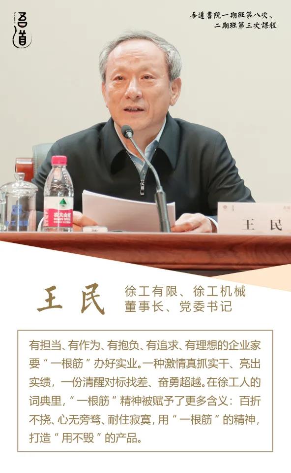 徐工有限、徐工机械董事长、党委书记,吾道导师王民围绕《中国制造 世界力量——双循环格局下全球化徐工的珠峰登顶之路》主题,深情回顾徐工从小到大、由弱到强、不断攀登产业珠峰的不凡征程,并与在座学员以问答形式展开深入交流。