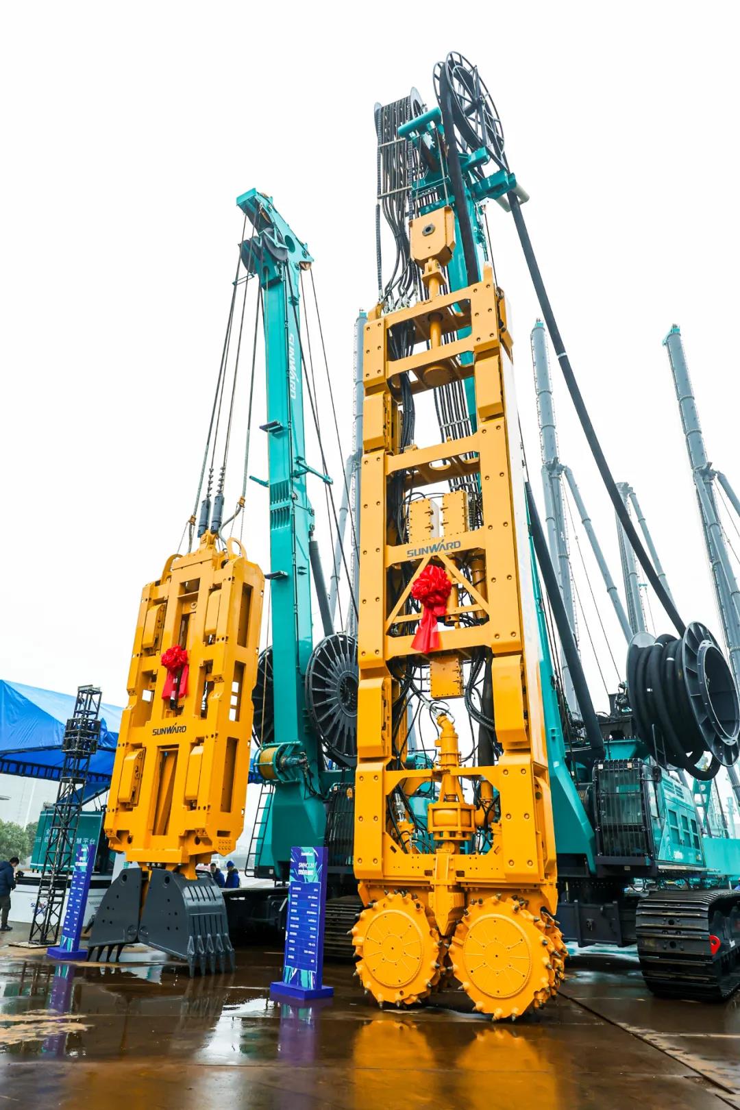 在发布会现场,山河智能自主研发的两款“世界之最”产品——世界最大旋挖钻机、世界最高全液压履带桩架,以及两款“世界首创”产品——引孔式静力压桩机、大直径植桩钻机,吸引了大家的目光。