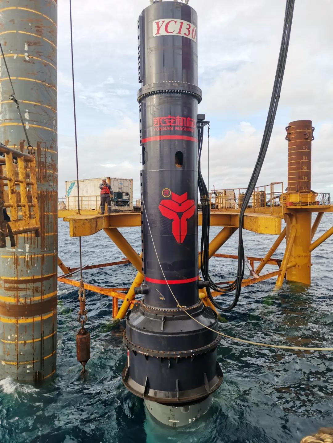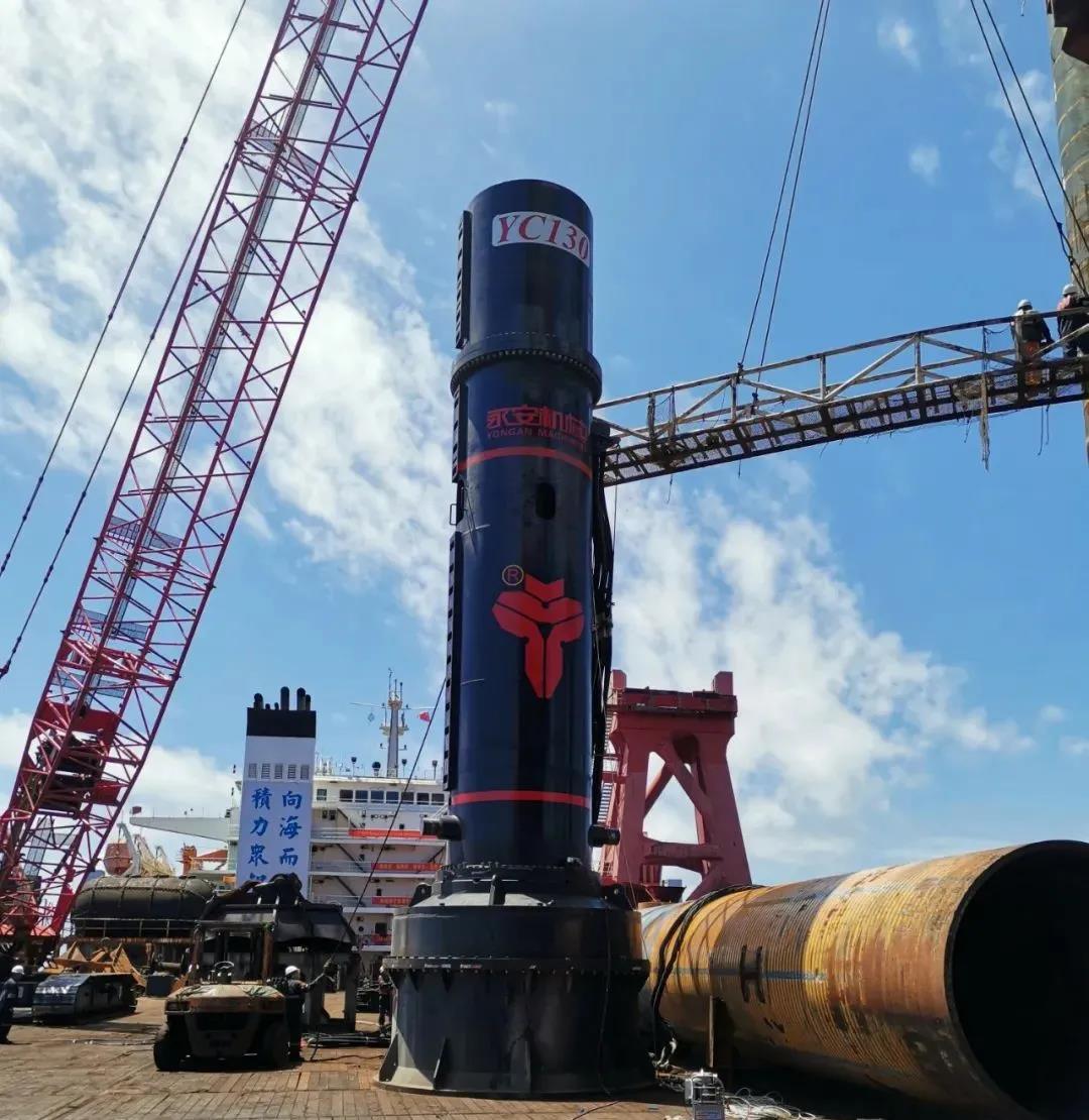 YC-130液压冲击锤配备2600P动力站,锤芯质量130吨,打击能量2210千焦 ,工作行程200-1700毫米,满行程最大打击频率25次/每分钟,打击能量大,打桩效率高,做功时间短,穿透能力强,满足长时间海上施工作业要求。YC-130液压冲击锤的成功应用不仅为国产设备争光,更为华西海工节省了数千万元的设备成本和数月的供货周期。
