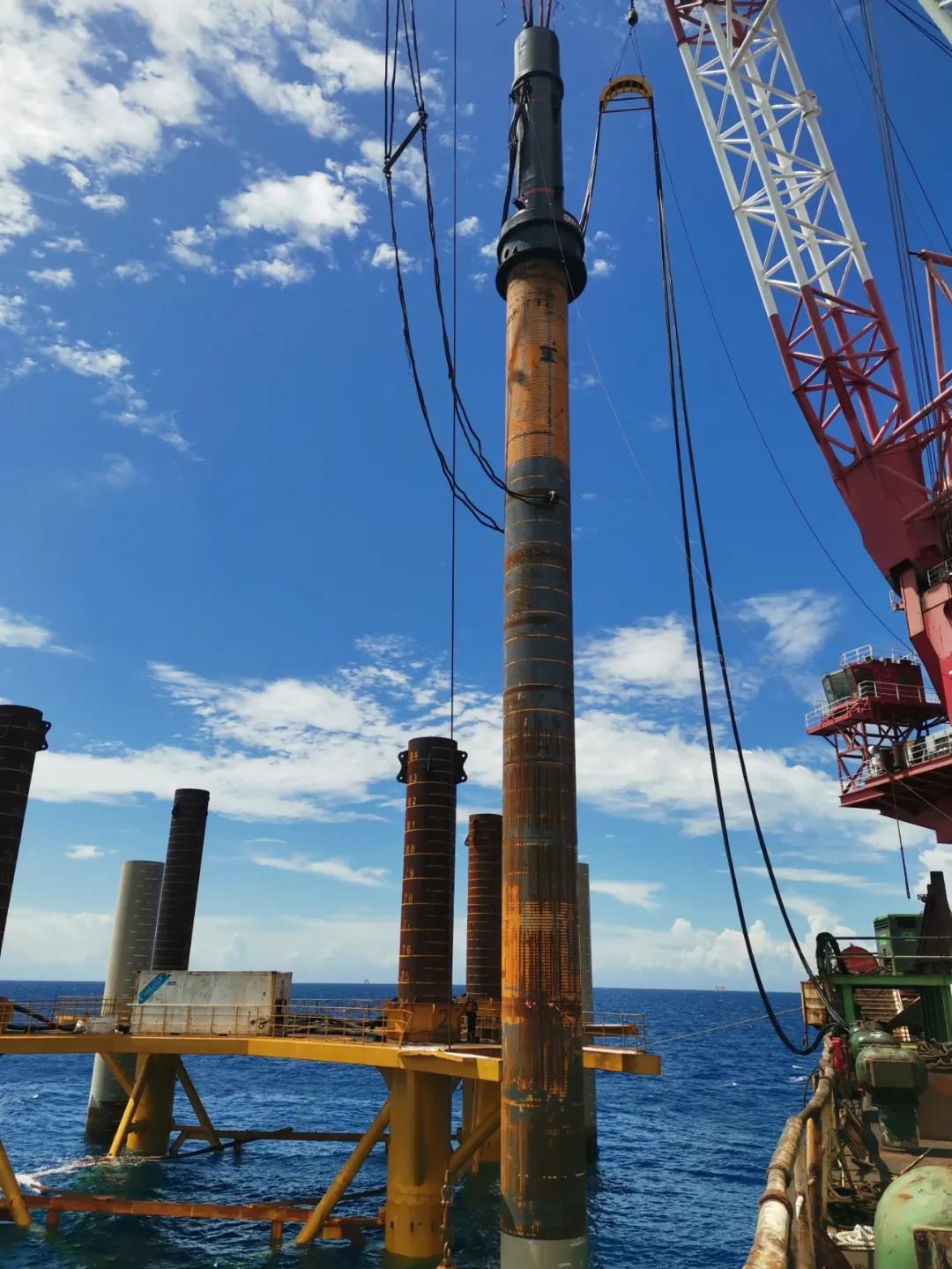 广东华电阳江青洲三500MW海上风电项目是我国离岸最远、水深最深及总装机规模最大的海上风电项目之一。本项目中,华西海工使用永安机械YC-130液压冲击锤和FZQ-600翻桩器,YC-130液压冲击锤是永安机械根据海上风电高盐雾、风大浪急的情况研发出的新产品。在现场使用过程中,YC-130风雨无阻,日夜奋战,争战“窗口期”,该海域地质条件复杂,施工难度较大,虽然最轻松的机位沉桩只需800锤左右,但也经常遇到难打的机位,需要4000锤以上才能完成沉桩,连续锤击时间超过8小时以上,彰显了国产设备同样的可靠性。最后,YC-130顺利完成本项目沉桩任务,其中2021年8月份高效完成20套基础桩沉桩施工,平均1天1个机位,体现了国产打桩锤同样具备高效的施工能力,并获得了业主单位的高度赞赏。
