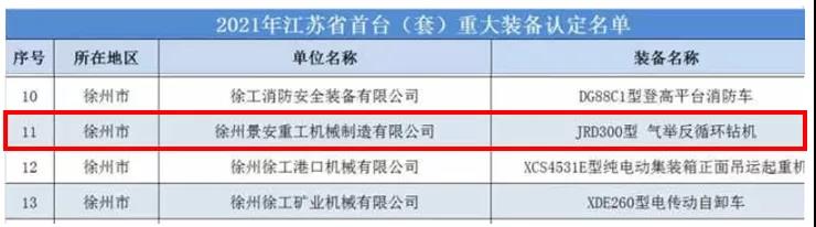 近日,江苏省工业和信息化厅下发通知,公布2021年度江苏省首台(套) 重大装备认定名单,全省共有43个装备获得认定。徐州市4个获得首台(套) 重大装备认定的产品均来自工程机械行业,徐州景安重工机械制造有限公司JRD300型气举反循环钻机位列其中,徐州景安重工是徐州市获得此次认定的唯一一家从事工程机械整机装备研发制造的民营企业。