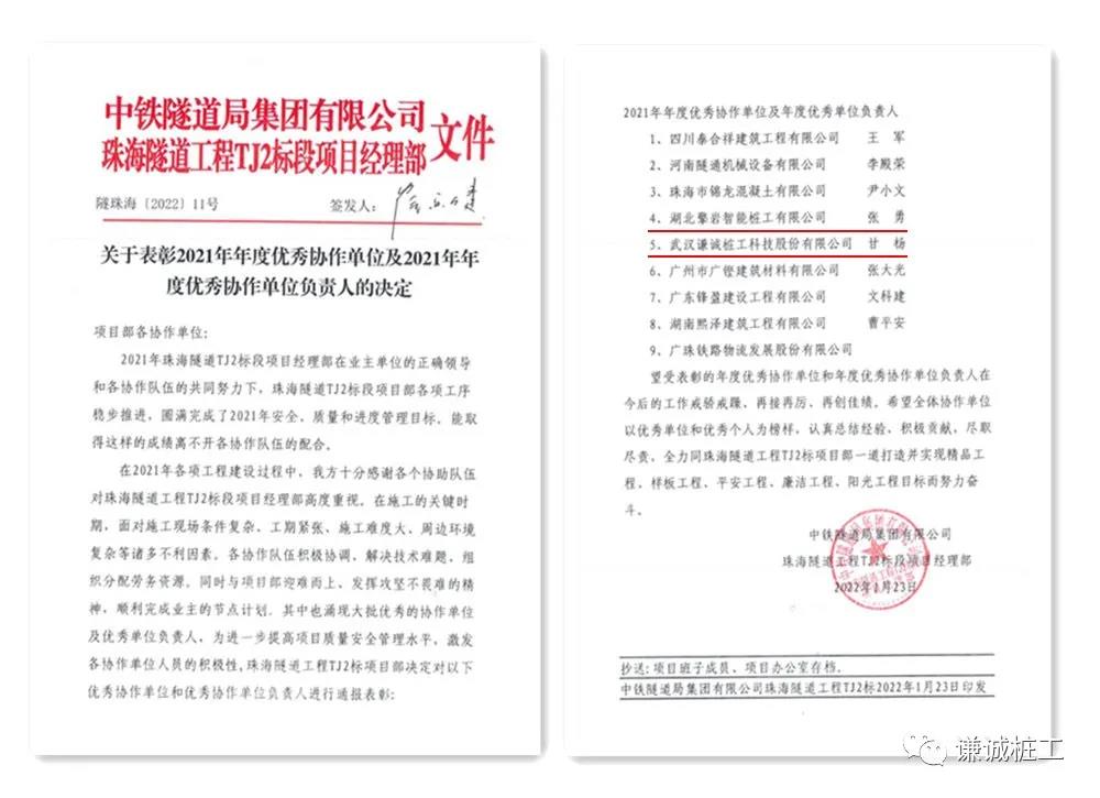 除现场表彰外,在公司参建珠海隧道TJ2标项目,总包方中铁隧道局集团于1月23日发布《关于表彰2021年度优秀协作单位及2021年年度优秀协作单位负责人的决定》,谦诚桩工TJ2标项目经理甘杨、新材料事业部材料主管张勇榜上有名获表彰!