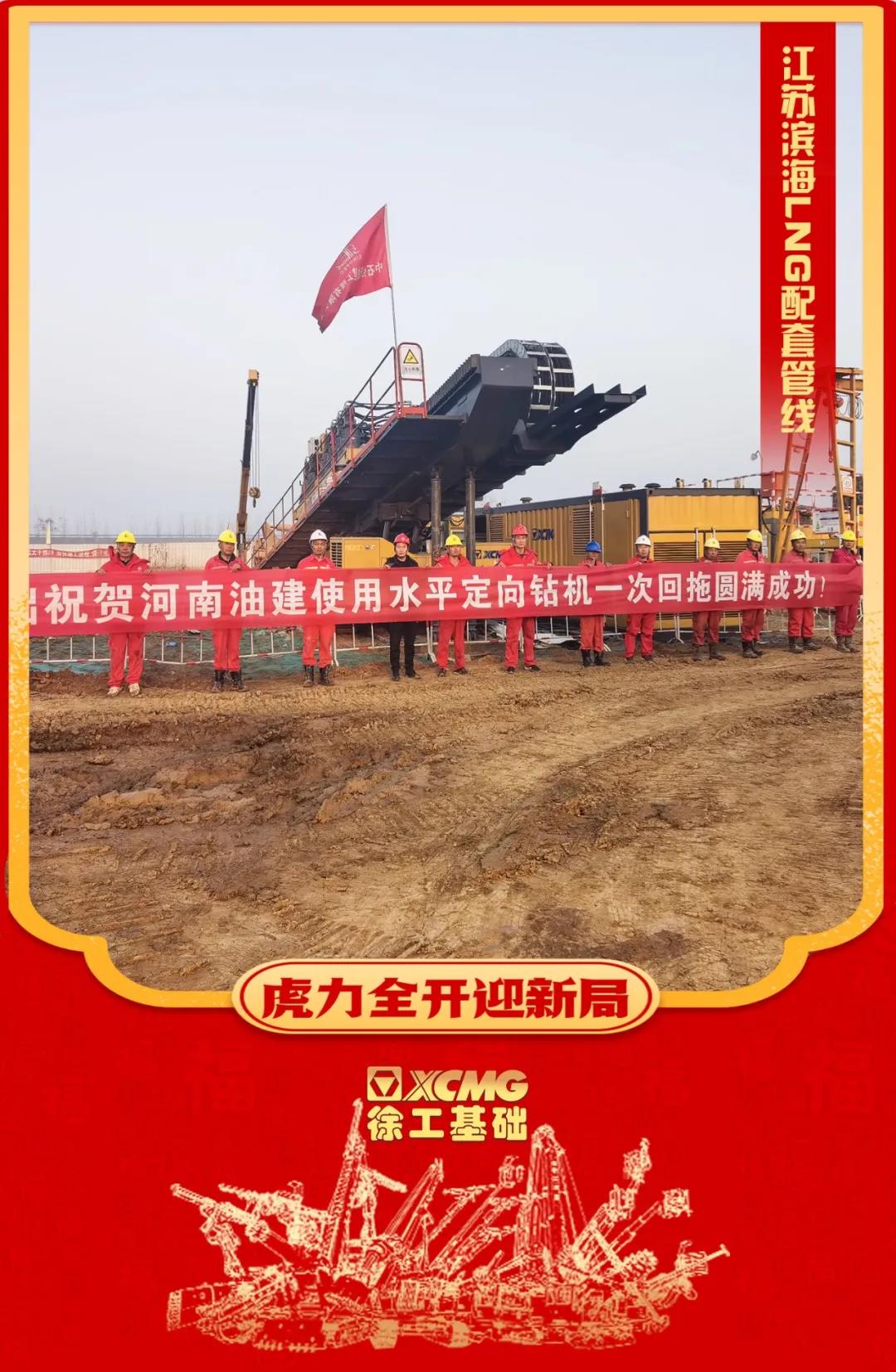 徐工XZ11600水平定向钻机承揽施工的江苏滨海LNG配套管线安徽天长-合肥项目二标段QJ052---QJ053荒草三圩龙虾池穿越首钻一次回拖成功。