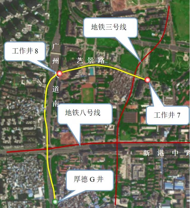 此外,该工程区间位于艺景路下方567m及广州大道下方918m,周边临近建筑物主要为艺景苑、垃圾房、地税局。同时,盾构隧道分别在7#~8#区间XK1+515位置从运营的地铁三号线上方跨过,隧道之间垂直距离为6.1m;盾构隧道还在8#~G井区间XK2+635位置下穿运营中地铁八号线,隧道之间垂直距离4.1m。这些苛刻的环境条件,给设备施工带来了极大的难度和风险。