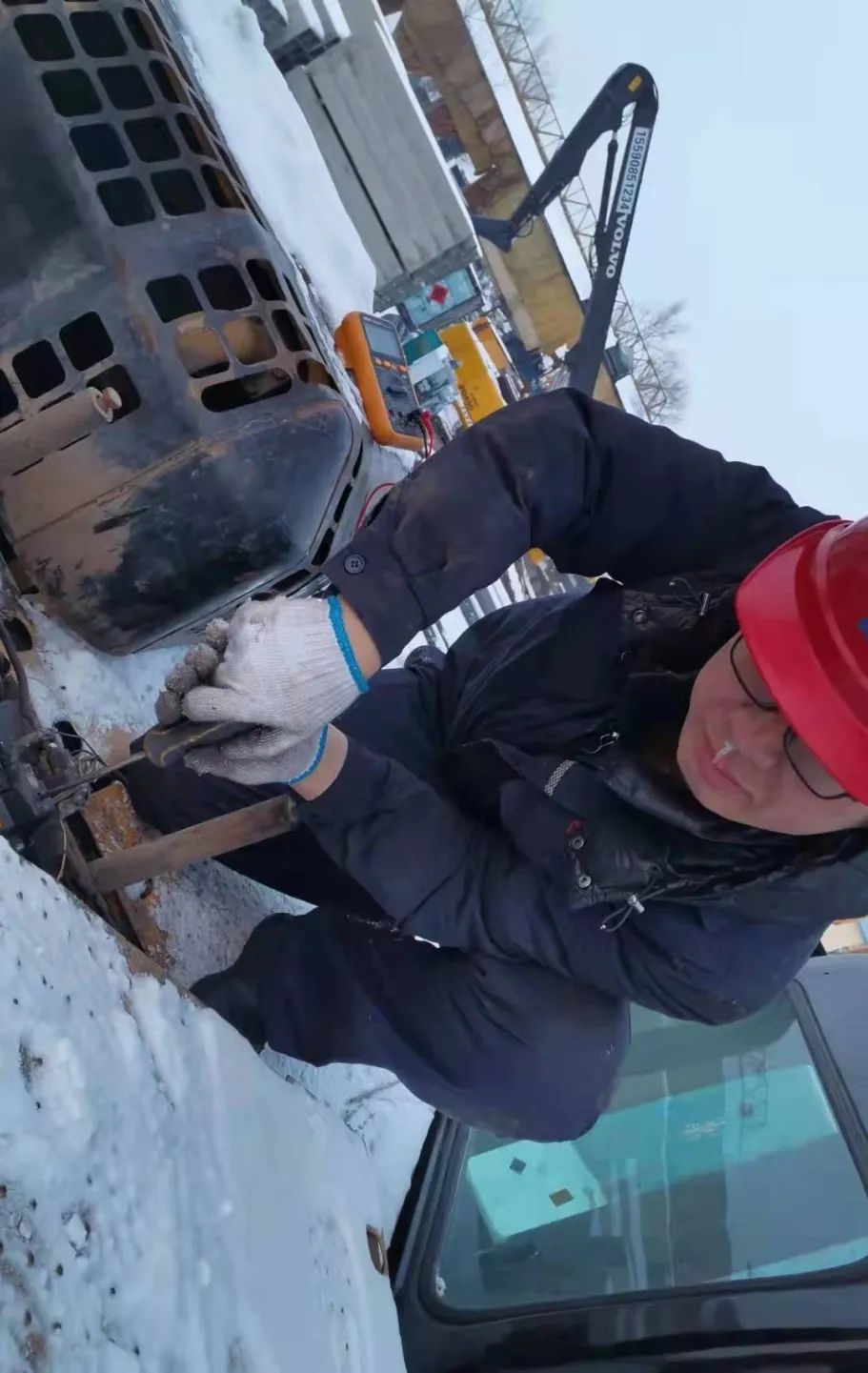 2021年11月25日,-28℃,服务工程师李春亮接到EVI订单,该设备是从山东省转到我区域。设备下拖车时发动机无法启动。根据经验判断应该由于当地气温较低,燃油系统出现了问题。订单就是命令,我工程师快速反应立即前往客户工地。当我们到达客户工地时,冻的瑟瑟发抖的操作手看到了希望,焦急万分的拖车司机也面露微笑。