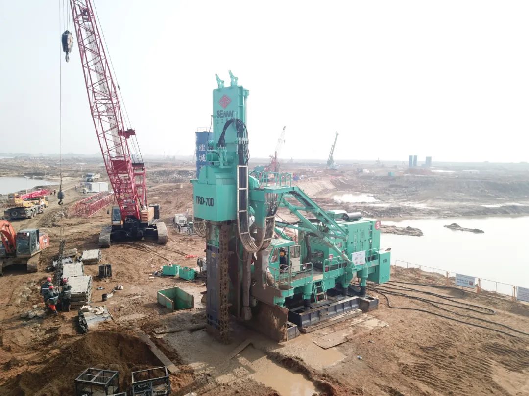 作为行业内TRD工法机领军企业,此次参建项目集结上工机械3台TRD-60D、3台TRD-70D工法机,上演群机施工大场面,面对施工现场抢工忙,上工TRD设备安全高效配合,低故障,克服工期紧,任务重等诸多困难,快速适应施工环境,优异的施工表现和强悍的产品性能有效保证了项目的施工效率。