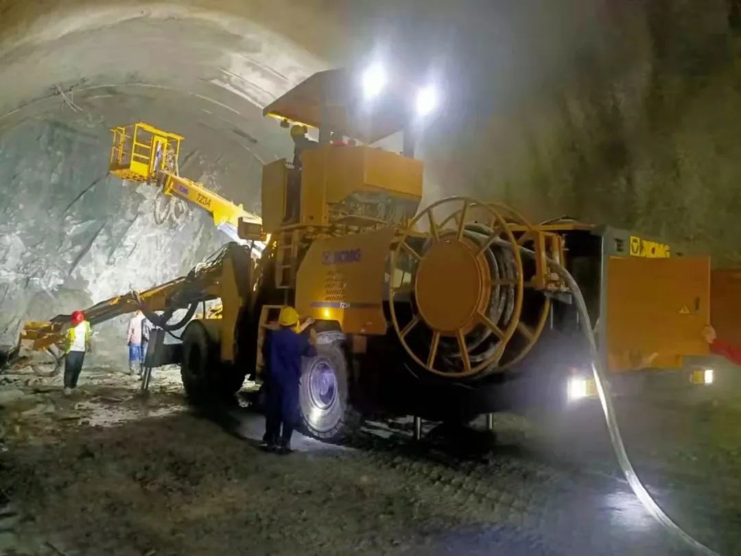 徐工TZ3A三臂凿岩台车在武九高速公路控制性工程--高楼山特长隧道进行主洞开挖工作,该工程最大埋深1680米,是集岩爆、突涌水、溶蚀结晶、岩溶、高地温等多种复杂技术难题为一体的隧道。