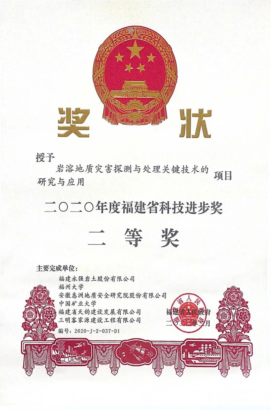 永强岩土牵头完成的《岩溶地质灾害探测与处理关键技术的研究与应用》项目获2020年度福建省科技进步奖二等奖,该项目由永强岩土、福州大学、中国矿业大学等单位联合申报。