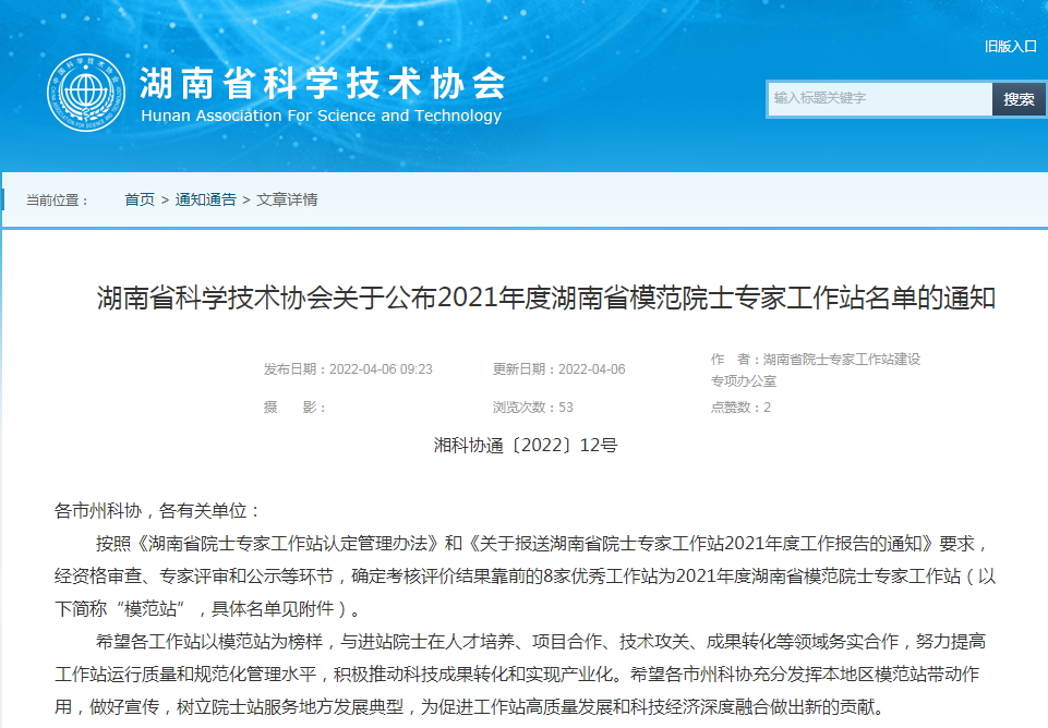 据悉,湖南省科学技术协会组织专家对参加2021年度考核的50家院士专家工作站进行了考核评审,对参加模范站评选的42家工作站进行了综合评审、部分现场考察、考评结果公示等。通过对工作站基础条件情况、运行管理情况、工作站成效及院士专家满意度等四个方面进行综合考评,评选出8家湖南省模范院士专家工作站。