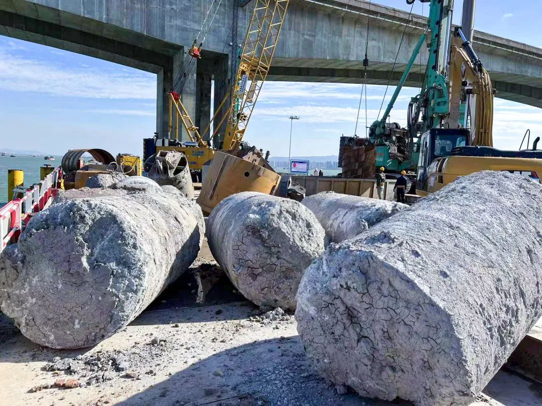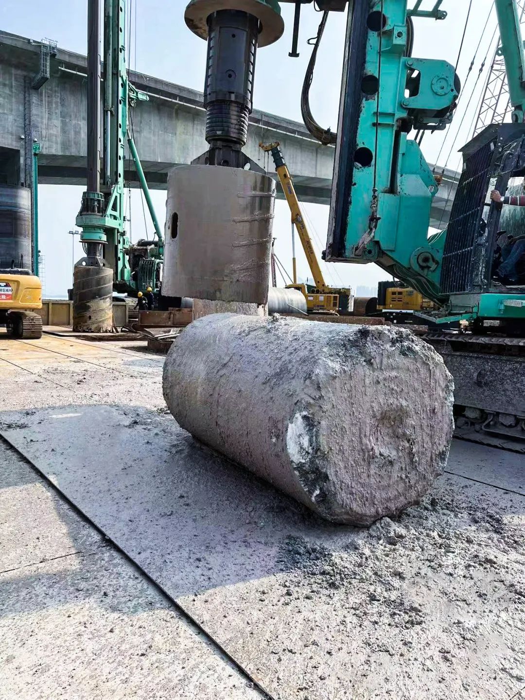 江门宝锐的钻具配合金泰设备在近100米深处取芯,入岩深桩溶洞斜岩,现场能够看到1600x2800mm岩芯直接从地下102米处抽取上来,同时,1600mm和2000mm直径微风化硬岩取岩芯完整,设备施工效率高。