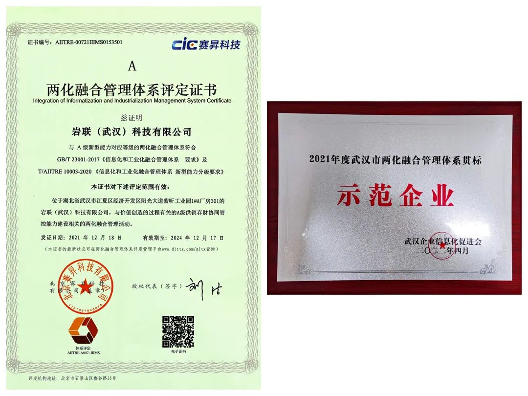 4月8日,岩联技术获评武汉市“两化融合”管理体系贯标示范企业,这标志着岩联的信息化与工业化、数字化深度融合获得权威认可,为企业数智化发展打下了坚实基础。公司将继续推进信息化和工业化深度融合,响应国家战略号召,积极推动“中国制造2025”进程,加速企业信息化管理建设、工业化升级智造。